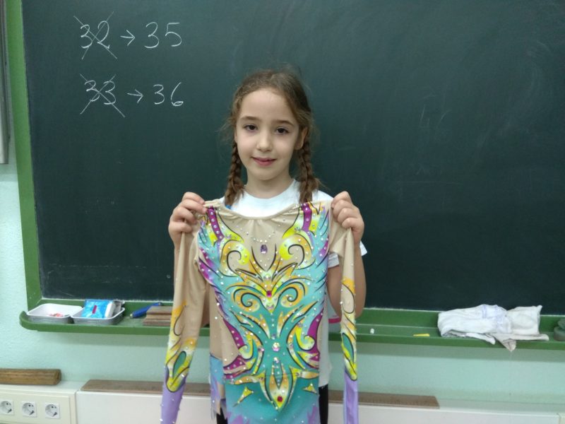 Hoy Carla M. nos presentó el traje que utiliza para una de sus pasiones: la gimnasia rítmica. Según nos explicaba, este traje está hecho por una modista, exclusivamente para ella. Su entrenadora lo decoró con unos bonitos brillantes. ¡Suerte en tus competiciones, Carla!