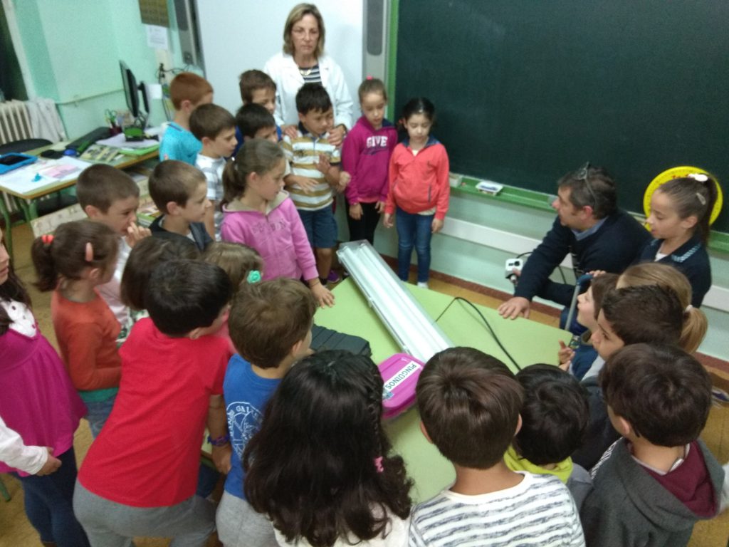 También medimos la temperatura con un termómetro especial. Vimos cómo funcionaban unos fluorescentes similares a los que tenemos en el cole e incluso averiguamos el PH del agua con un aparato que nos confirmó que el agua que usamos para regar nuestras plantas, así como el agua de los peces de la clase tienen el PH adecuado.