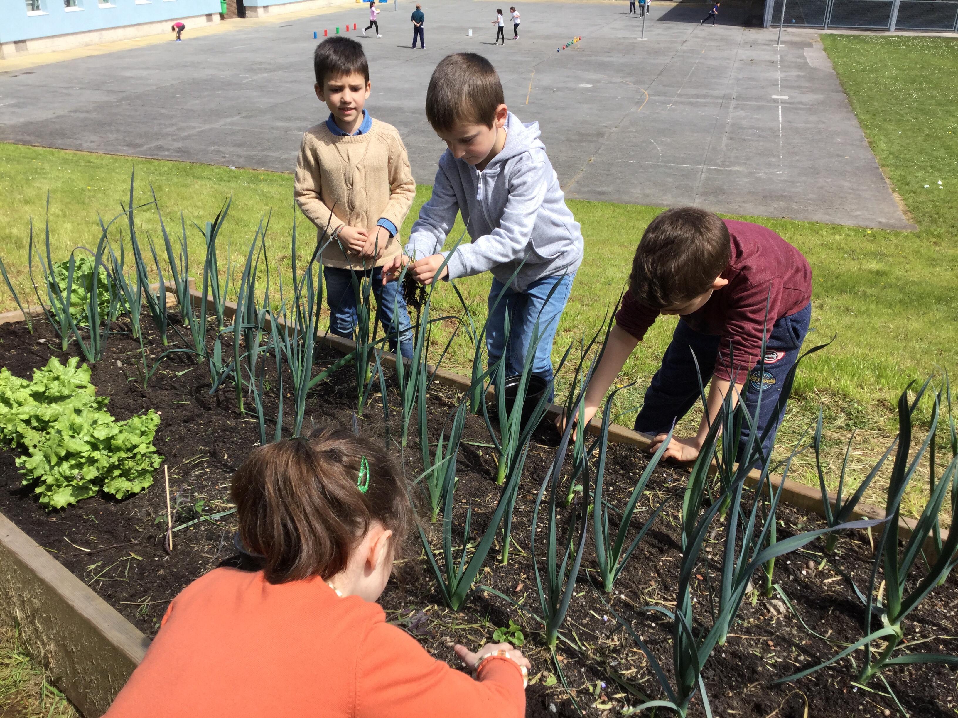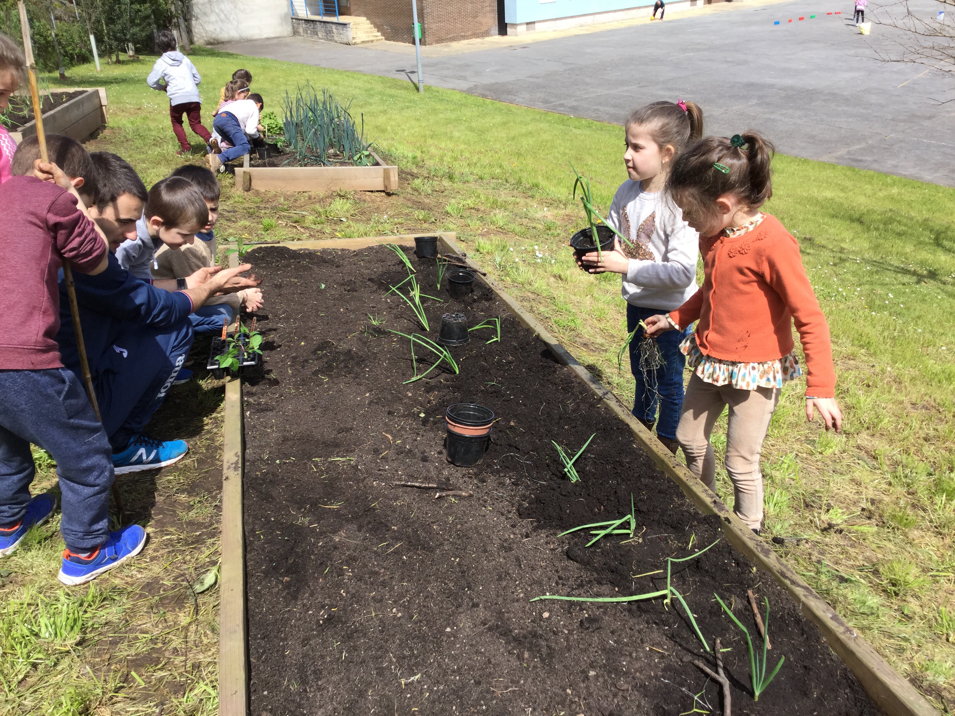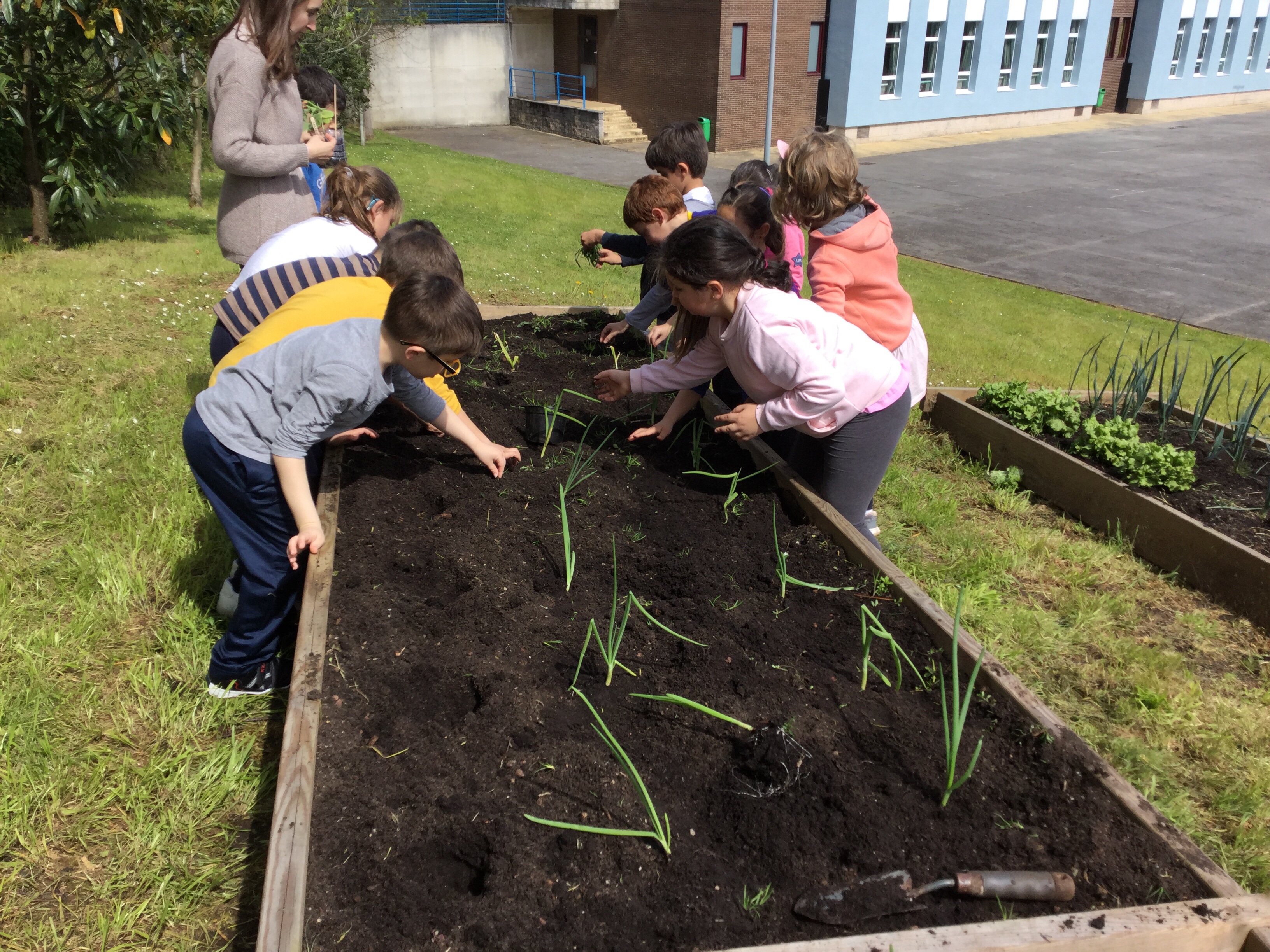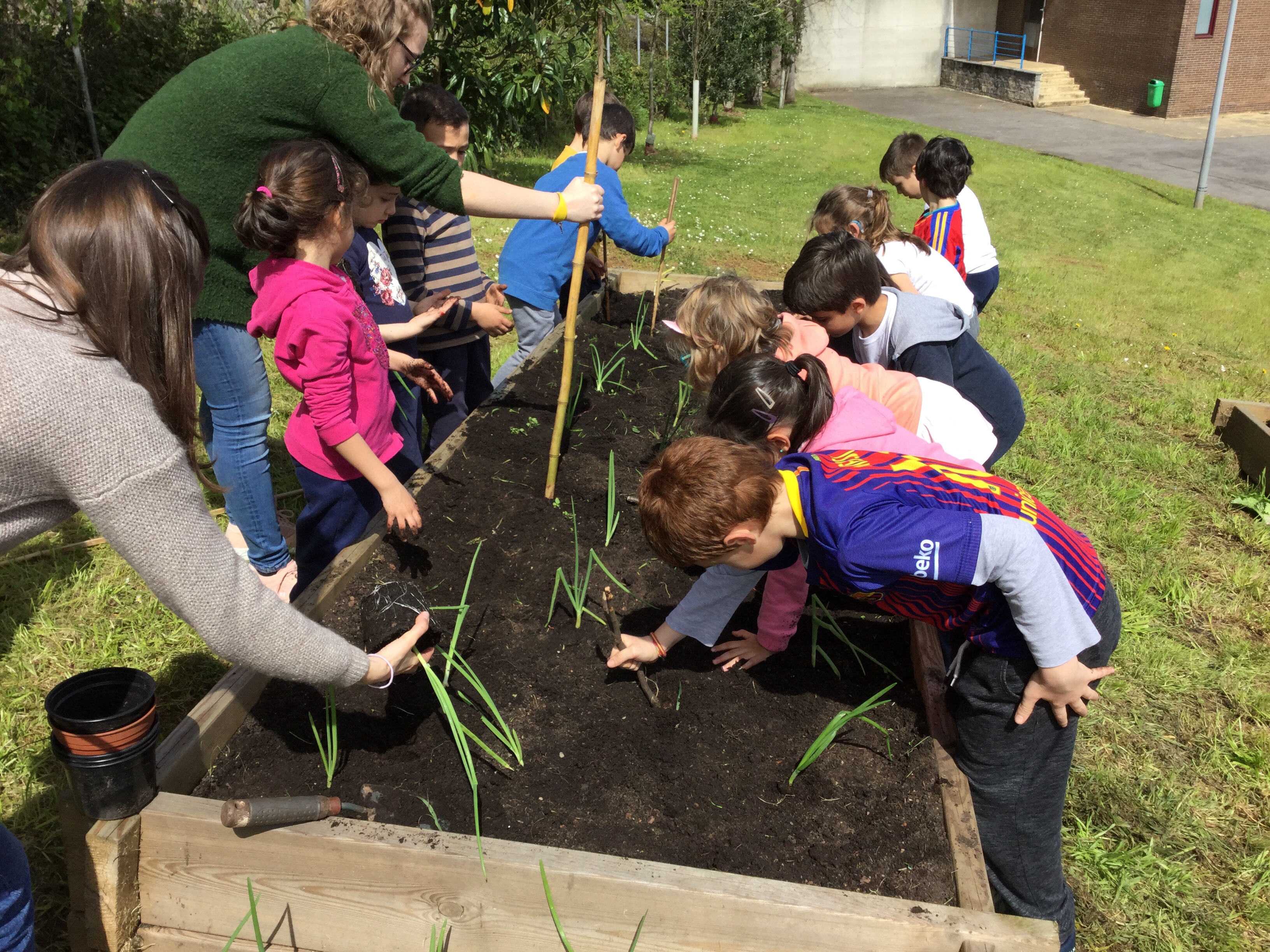 Como sabéis, el año pasado instalamos nuevos parterres para poder trabajar más cómodamente. Ya habíamos plantado brécol este curso, pero ahora le ha llegado el turno a unas cebollas que nuestros compañeros de 6º curso germinaron en semilleros. También aprovechamos para hacer limpieza y recolectar un par de lechugas que estaban listas para ser consumidas. La suerte quiso que Laura y Selina se las llevasen a su casa para preparar una deliciosa ensalada.