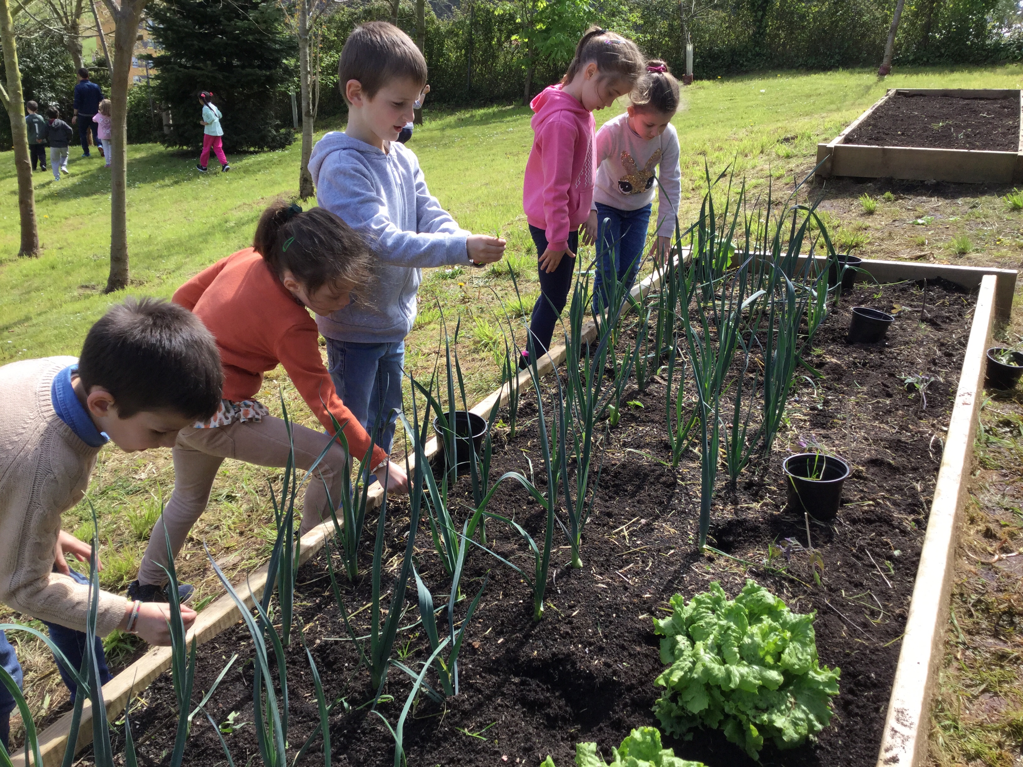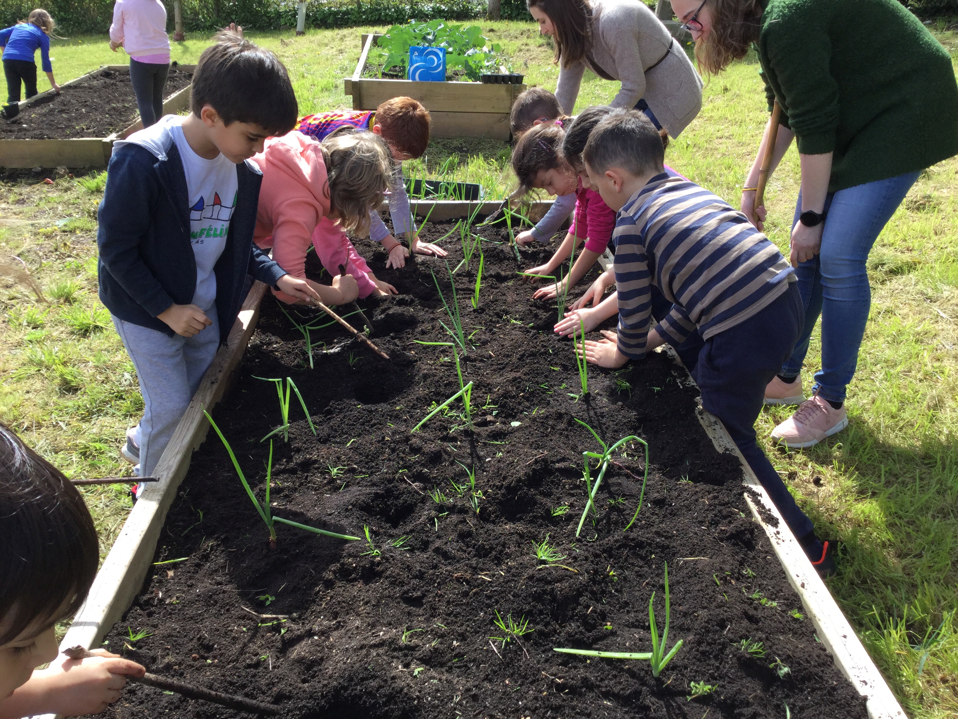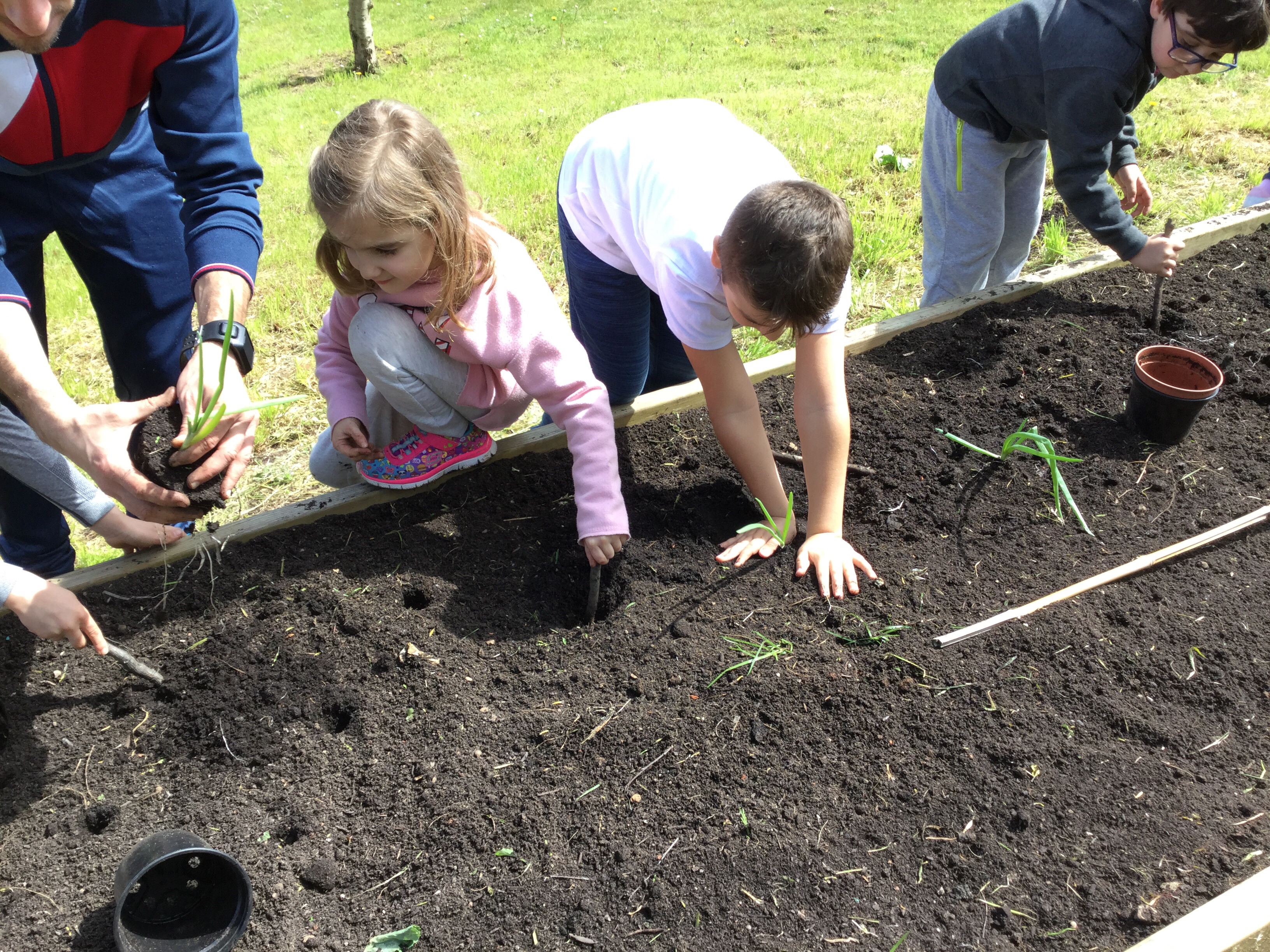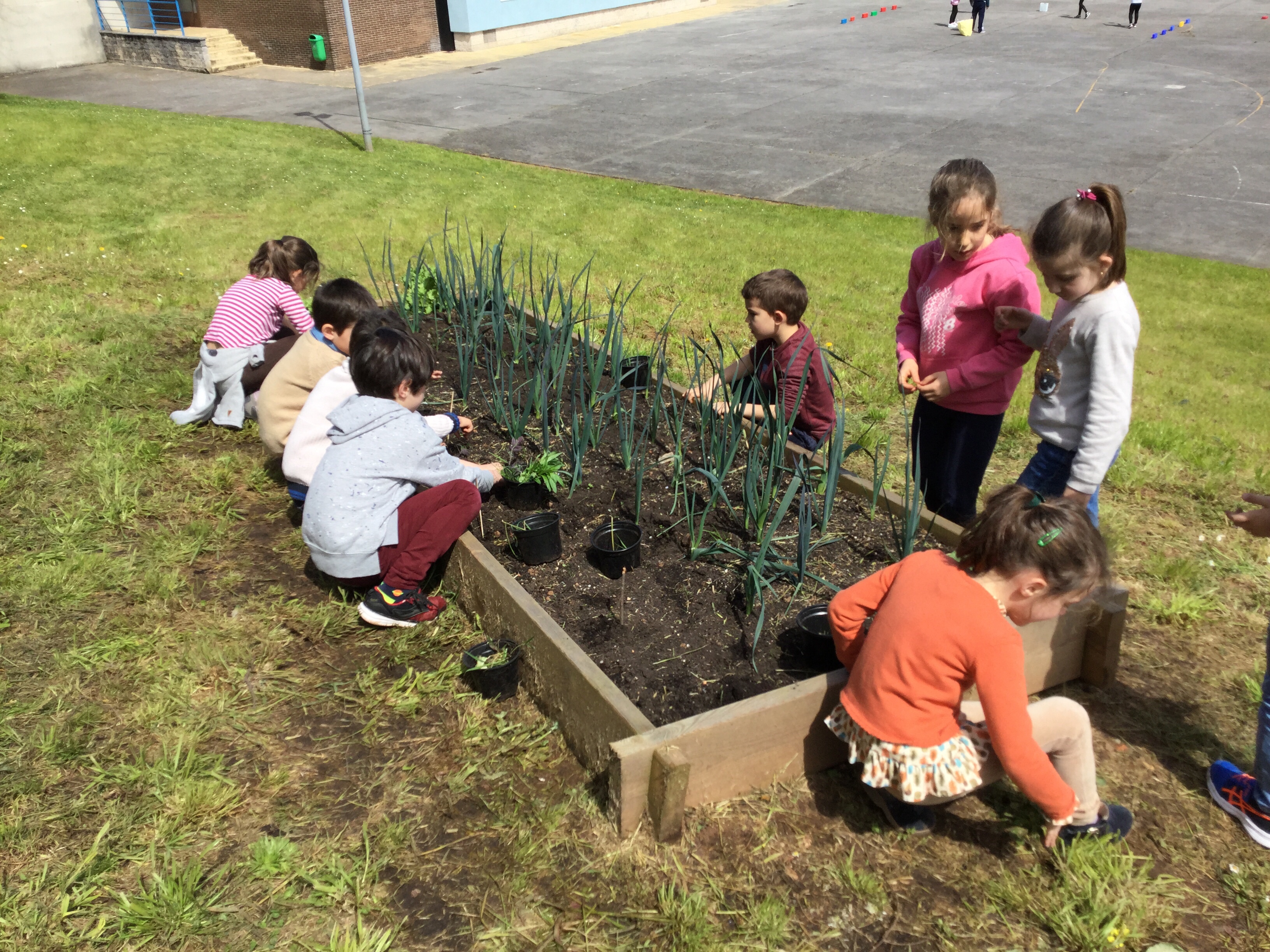 Como sabéis, el año pasado instalamos nuevos parterres para poder trabajar más cómodamente. Ya habíamos plantado brécol este curso, pero ahora le ha llegado el turno a unas cebollas que nuestros compañeros de 6º curso germinaron en semilleros. También aprovechamos para hacer limpieza y recolectar un par de lechugas que estaban listas para ser consumidas. La suerte quiso que Laura y Selina se las llevasen a su casa para preparar una deliciosa ensalada.