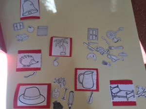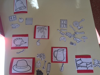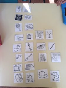 En este caso, yo muestro una tarjeta con un dibujo. Reparto unos dibujos de manera aleatoria. En voz alta se dice la palabra que sale en la tarjeta y se buscan los dibujos que terminen de la misma manera. Se van haciendo grupos. Este ejercicio de buscar los finales, les resulta un poquito más difícil y hay que ayudarles marcándolos los finales y con apoyo gestual.
