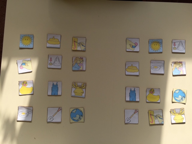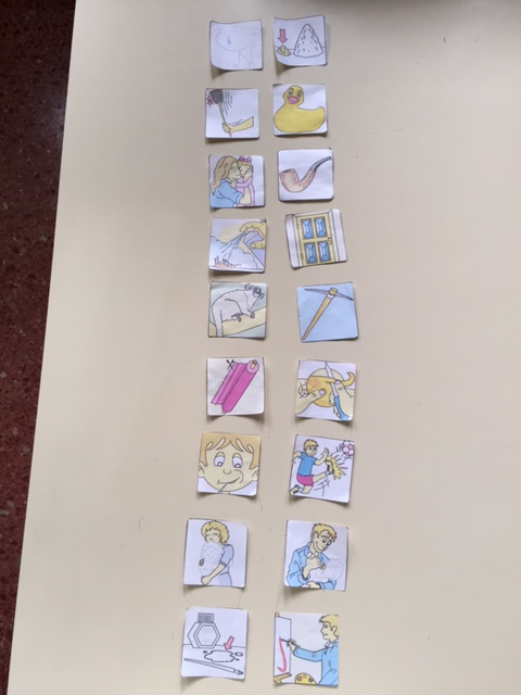 El juego consistía en que después de presentar cada palabra: significado, sonido, en qué se parece, en qué se diferencia,… a cada niño se le entrega una palabra que sólo puede ver él. Todos estamos de pie en la clase, cada uno con su palabra. Nos movemos por toda la clase de tal manera que nos mezclemos bien y después sólo podemos susurrar nuestra palabra hasta que encontremos la pareja que suena parecida. Cuando la encontremos, nos ponemos en un lado. Cuando todos estén emparejados decimos las parejas en voz alta y vemos si estamos emparejados correctamente. Este juego, les encantó!!!!!!