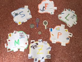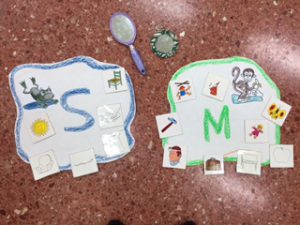 En esta ocasión hicimos un viaje en tren. Antes de empezar, repasamos el sonido de cada una de las estaciones y los billetes que llevaban a ellas (vocabulario que empieza por los sonidos de las distintas estaciones). Ese repaso lo hicimos apoyándonos en el gesto. Para los niños que aún tienen dificultades para identificar algún sonido, teníamos unos espejitos en los que se podían apoyar para ver el punto de articulación de la lengua, labios,… y así, le ayudase a identificarlo.
