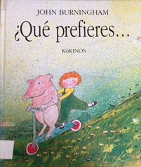 En esta sesión, hemos trabajado con un libro divertidísimo de la editorial Kókinos, de John Burningham (ISBN: 84-88342-05-5). Nos centramos en el trabajo de la expresión a través de la elección entre unas serie de opciones de lo más locas. Les encantó. Así que espero que lo trabajéis con ellos a través de las fotos que os mando. Sería genial que os explicaran el por qué de su preferencia, vosotros también podéis dar vuestra opción y decirles vuestras razones. Espero que os divirtáis mucho.