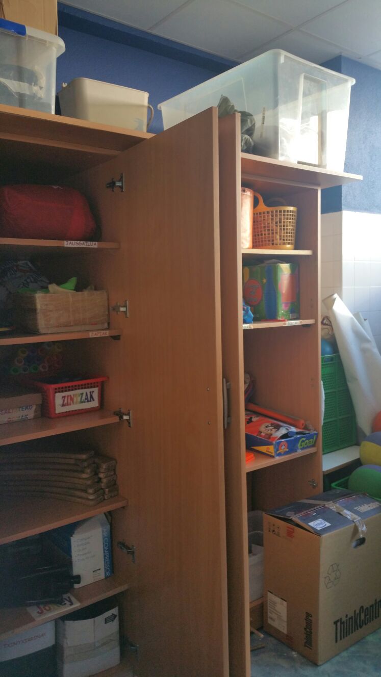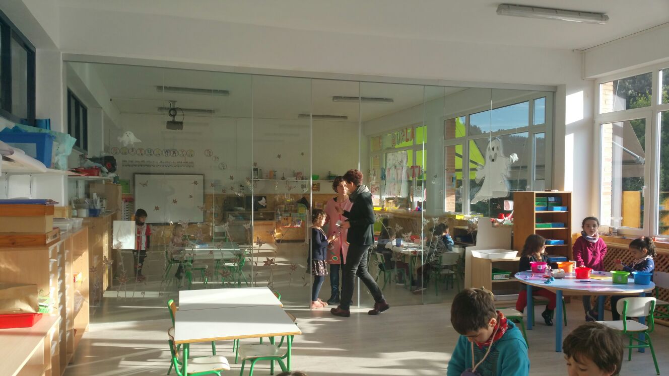 Nos dividieron en tres grupos para que pudiéramos ver la filosofía del centro. Os voy a intentar resumir un poco nuestras primeras impresiones al llegar. El pueblo, que es pequeño, principalmente vacacional y orientado al sector servicios, ellos comentaban que la única «fábrica» era el colegio, no había en el pueblo lugar que tuviese tantos trabajadores como la escuela. Tiene poca población de fuera y dominio del Euskera, comentan que es un pueblo muy euskaldun. Los edificios que forman el colegio, cuentan con bastantes años, no tienen grandes medios tecnológicos que puedan llamar la atención, pero su riqueza se basa en la dotación de personal, ya que son un cole de linea tres que posee mas de 50 profesores. Cuentan con niños de dos años que se integran en el día a día del centro. Las clases, son muy amplias, con biombos o puertas correderas que permiten acortar espacios. Son clases con grandes ventanales, muy luminosas, cosa que nos llamó la atención ya que los niños no se quejan de la luz, las cortinas siempre están abiertas. Las puertas de acceso al centros SIEMPRE están abiertas, incluso la verja que separa el instituto del colegio, para ellos esta apertura es algo natural, no se concibe que pueda ser de otra forma. Se observaba un espíritu de autonomía toral en los alumnos, ya que se movían libremente en por el centro, sin filas, sin pedir permiso,… y jamas tuvimos la sensación de caos. Si es cierto, que el espacio, tanto de aulas, pasillos, ..permite esa movilidad por su amplitud.