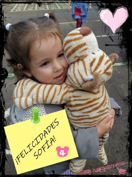 Y es que a pesar de estar de vacaciones no podíamos dejar de felicitar a nuestra compi Sofía que ¡hoy cumple 4 añazos! ¡Felicidades! Esperamos poder vernos pronto en el cole y celebrarlo. Un beso y un abrazo de todos los morados.