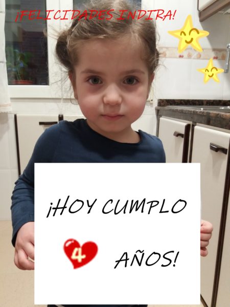 Hoy se une al selecto club de los 4 años nuestra compi Indira. Espero que lo celebréis por todo lo alto y que cuando volvamos al cole podamos festejar todos juntos. Un beso enorme y un tirón de orejas! Felicidades!