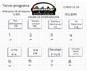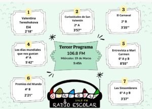 Este tercer programa, ha sido presentado por Paula de 6° B y Aroa de 6° B, grabando María de 6° B y en el sonido Laura de 6° B.