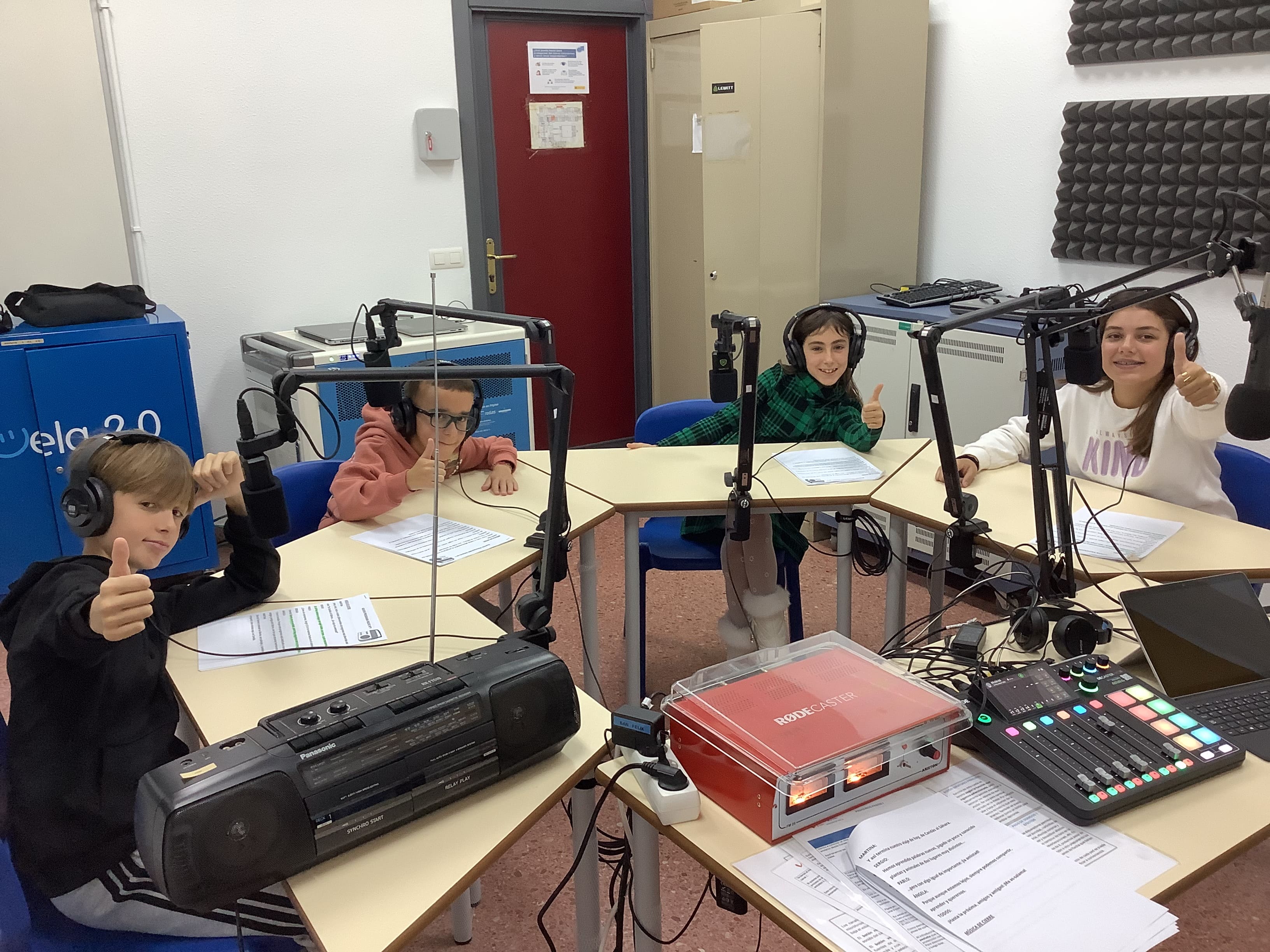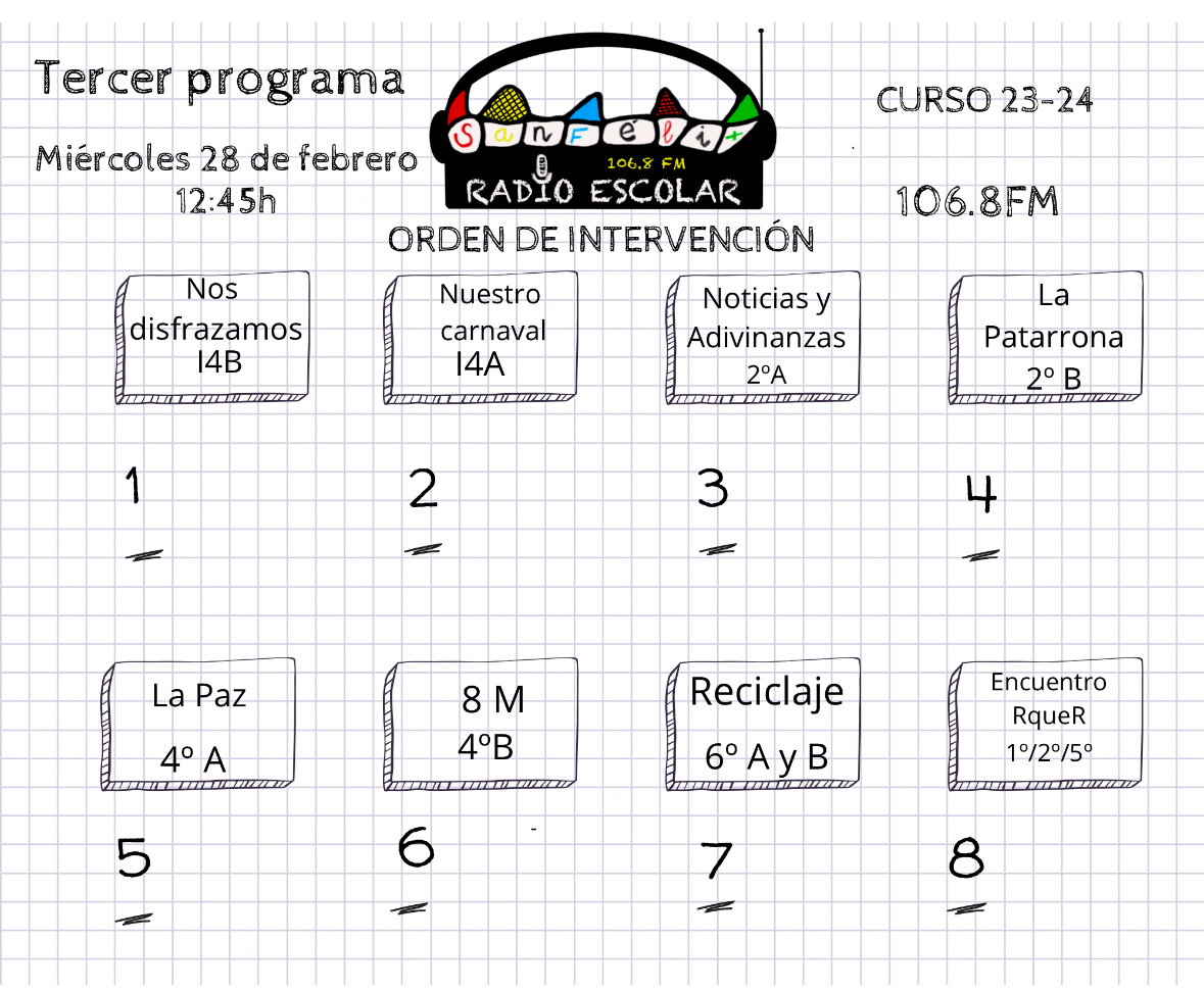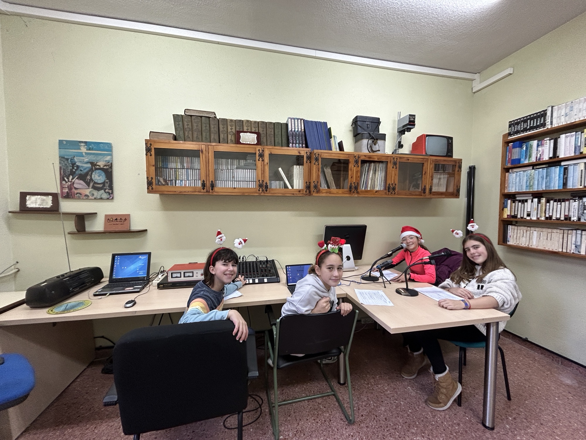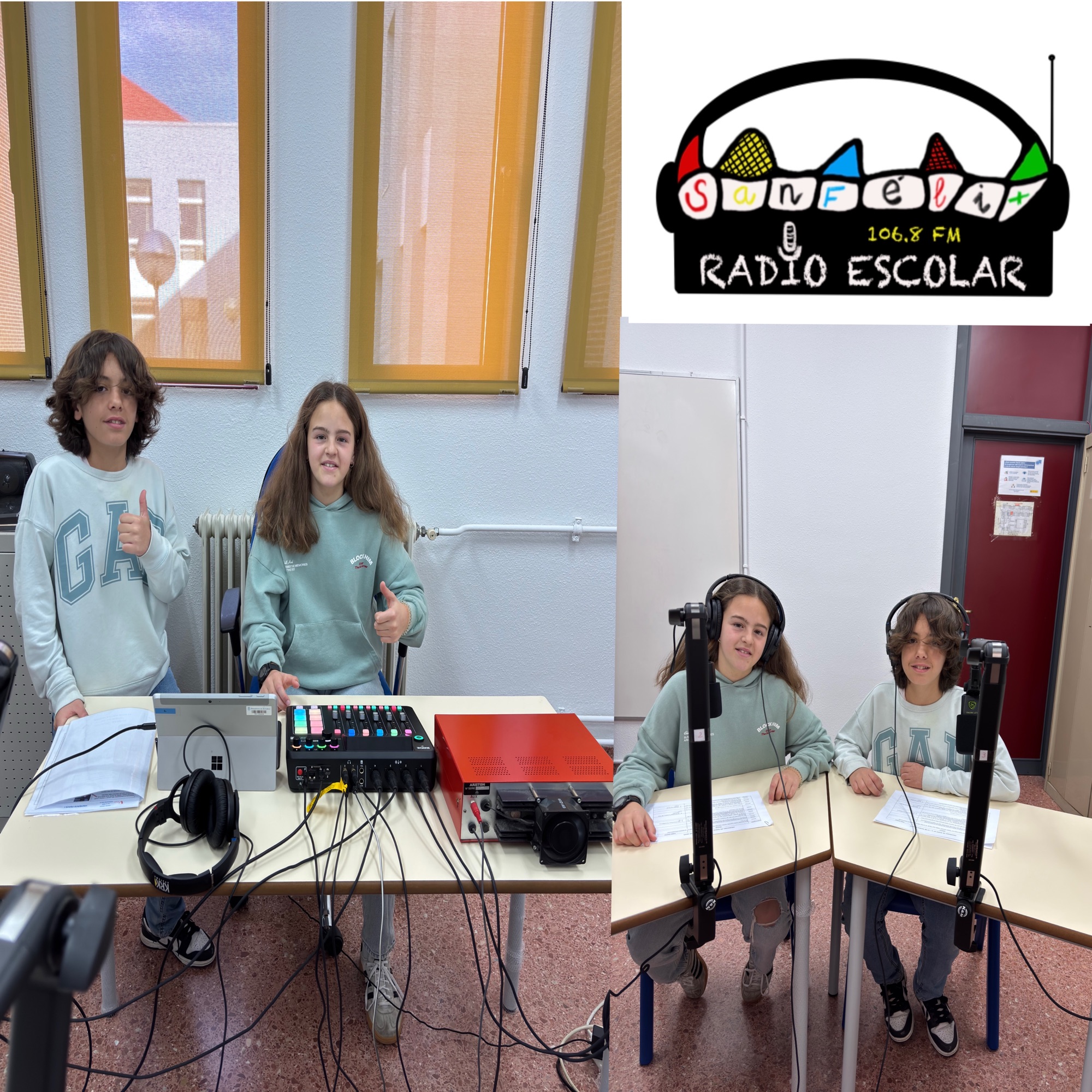 Presentan este programa, Marela de 6ºA y Candela de 6ºB. Daniela, de 6ºB colabora con las grabaciones y Mateo de 6ºA en la mesa de mezcla, controlando el sonido.