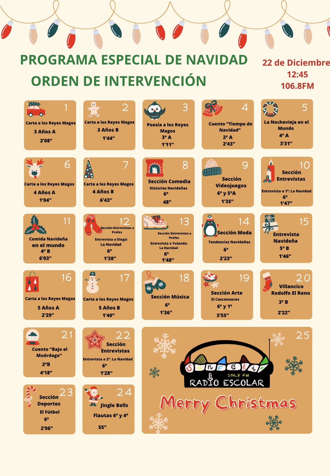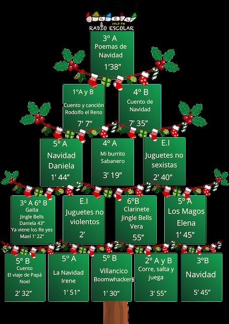 Ya se puede escuchar el segundo programa del curso, dedicado, como es tradición, a la Navidad. Tenemos las peticiones a los Reyes Magos de los alumnos y alumnas de infantil, poesías, curiosidades de la Navidad, cuentos, recomendaciones de libros…un poco de todo.