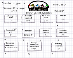 Este cuarto programa, ha sido presentado por Elena de 6° A y Dani de 6° A, grabando Olaya de 6° A y en el sonido Joel de 6° A.